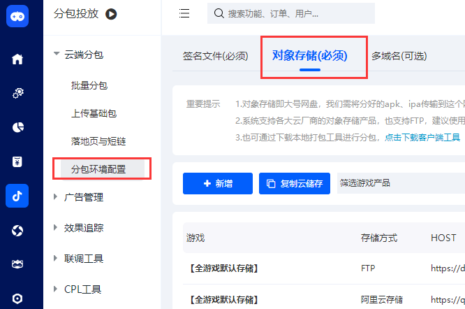 在SDK后台-分包投放-云端分包-分包环境配置-对象存储 里进行设置