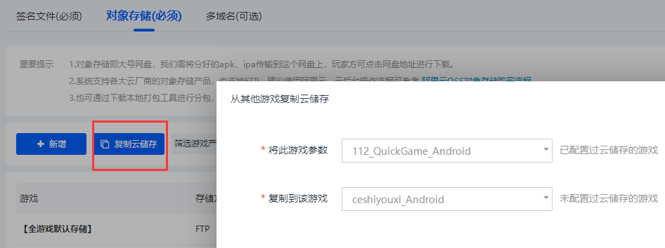 为减少厂商工作量,我们开发了云存储复制功能,配置好一个产品后,其他产品可以直接复制此配置