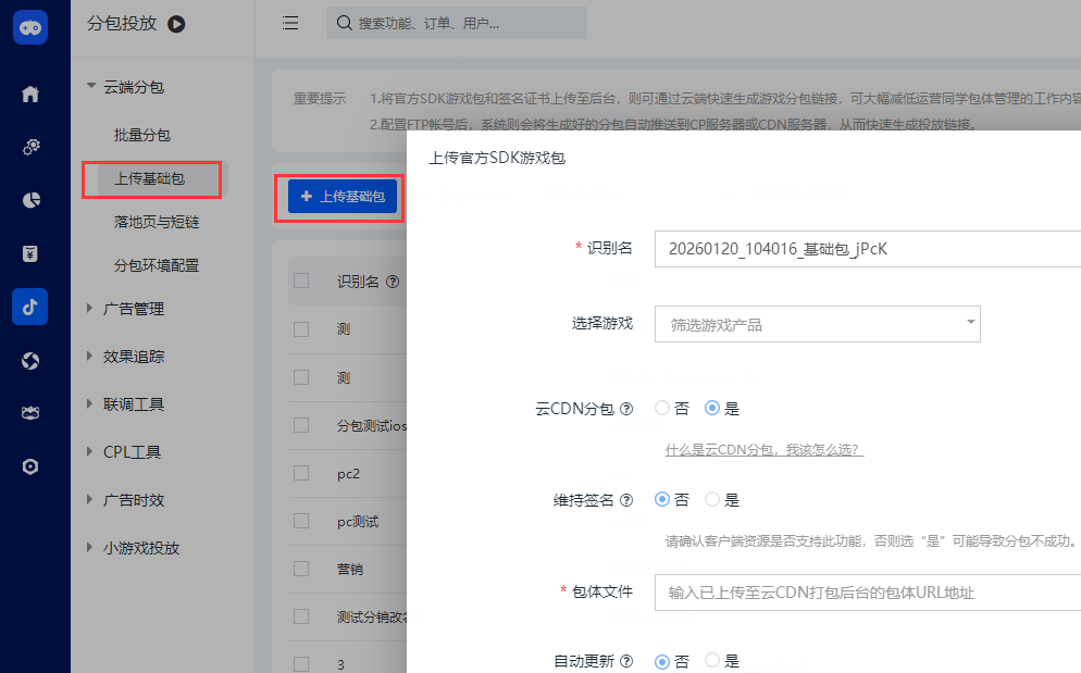 b. SDK后台-分包投放-云端分包-上传基础包,云CDN分包选择“是”