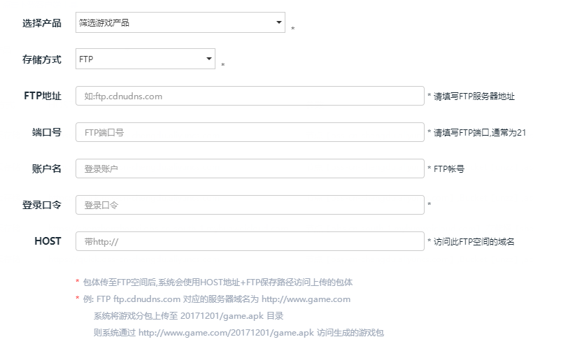 因云端分包,需要将分出的子包上传到服务器供玩家进行下载,因此需要配置下载包的储存方式