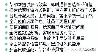 QuickSDK是一家致力于为发行商简化除研发以外所有环节的一站式服务平台。在手游行业发行的上下游环节做好自身的产品服务,提供一系列多元化的产品服务和体验,减少开发商的研发成本。选择QuickSDk,选择Quick云客服,让您的游戏运营so easy!