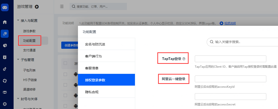 除QQ、微信登录外,TapTap以及阿里云一键手机登录还需要在 官方SDK后台-功能配置 里设置登录参数