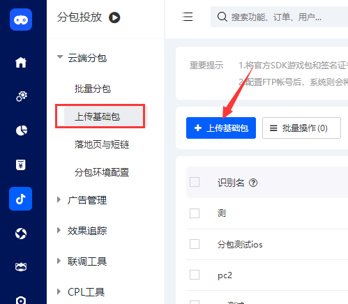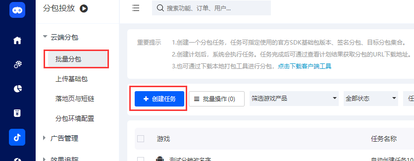 为了更好的服务于CP,QuickGame新增了在线分包工具,一键分包,更方便,更快捷。登录官方SDK后台->分包投放,设置好分包环境后便可进行在线分包