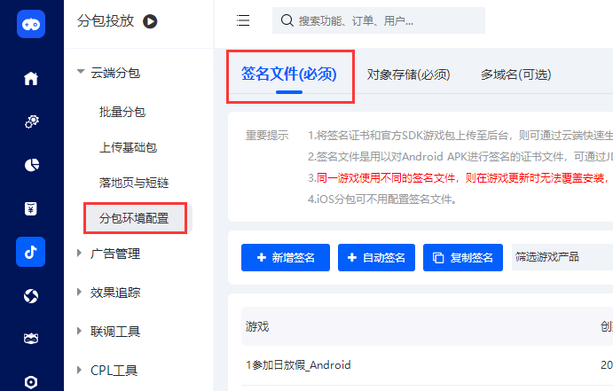 点击【新增签名】按照要求上传签名文件并配置签名秘钥(一个游戏只能配置一个签名文件)