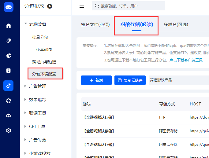 购买好OSS存储服务后,按照页面要求填入对应的参数值,分包时会把包传到相应的云储存服务器上