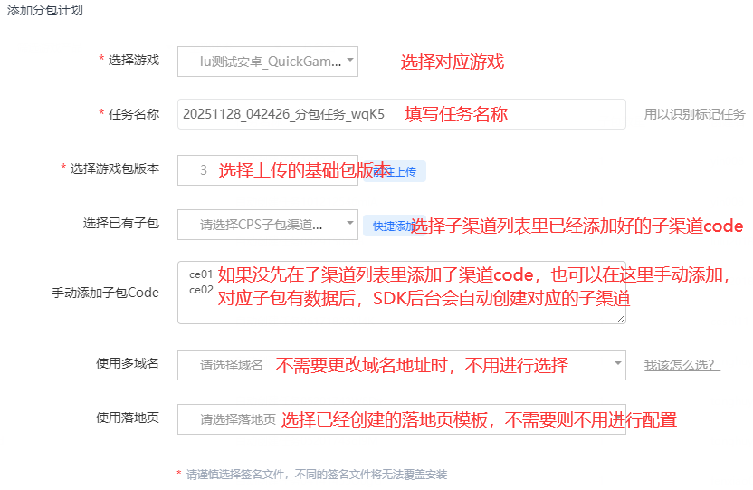 手动添加子包Code:如果还未创建此CPS渠道,可以手动添加后先进行分包,然后再去子渠道列表里进行创建,或者分出的CPS子包有数据后,SDK后台也会自动生成对应的子渠道(注:手动添加的渠道,分包完成后,渠道名默认和渠道CODE一致,如需修改渠道名,可以在游戏管理-子包管理-子包列表里进行修改)
