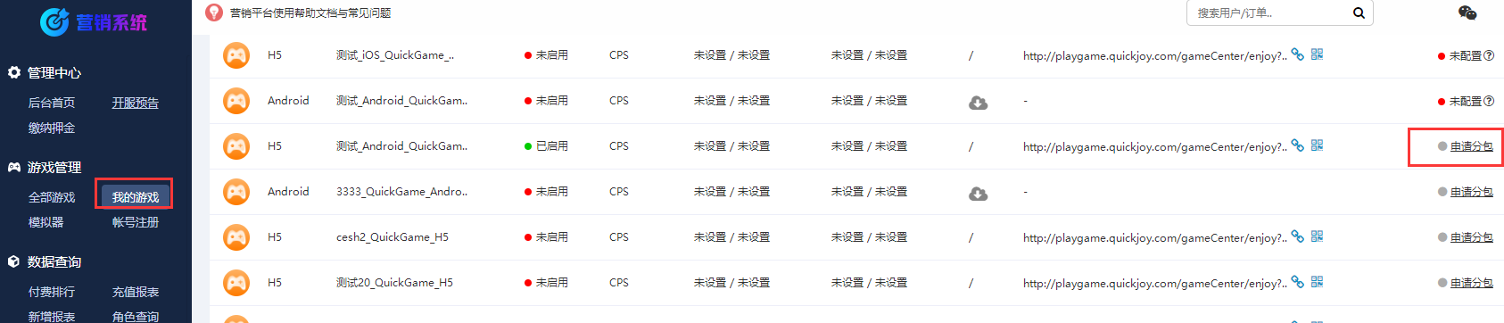 如有下级分销,SDK后台分包成功后,营销人员便可在营销后台-游戏管理-我的游戏里,点击【申请分包】直接获取下载链接