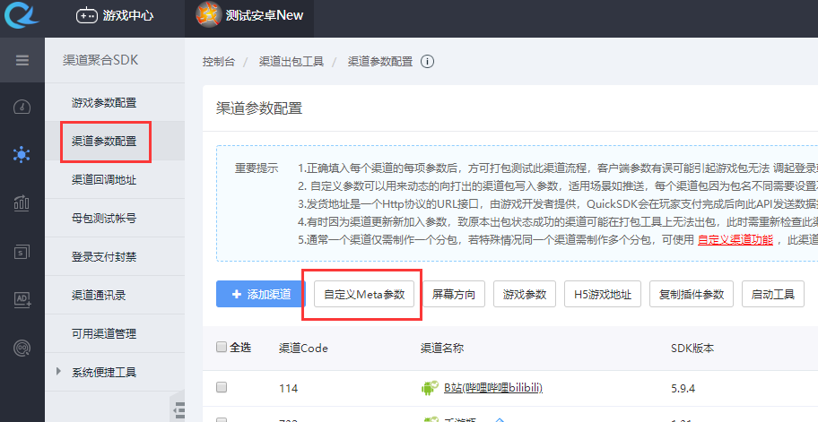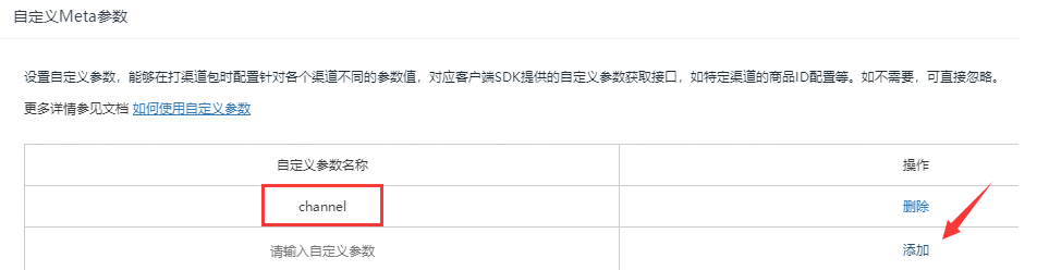 1、登陆聚合SDK后台,在“渠道聚合SDK-渠道参数配置-自定义Meta参数”里填写自定义参数名称
