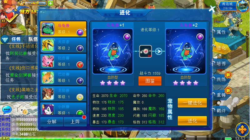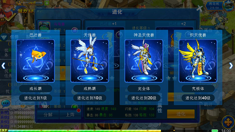究极体:当宠物进化到40级时宠物进化为究极体,完全体进化到救济体除了需要消耗宠物精魄外还需要消耗道具进化卡片γ