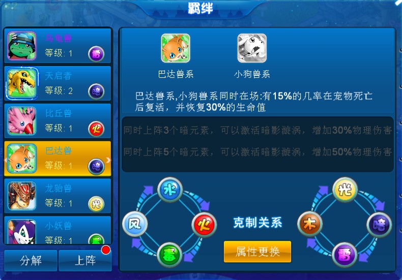 宠物属性对于宠物的队列有加成效果,上阵的五只宠物的相同属性按照数量的多少有着不同的体验!